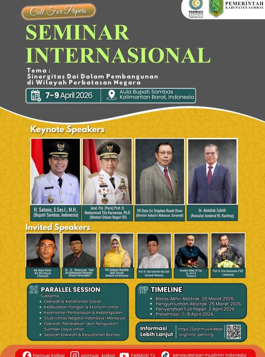 TERASBERITA ID, SAMBAS – Kabupaten Sambas, Kalimantan Barat, akan menjadi tuan rumah Seminar Internasional Dai yang digelar pada 7–8 April 2026 di Aula Kantor Bupati Sambas. Kegiatan ini mengangkat tema “Sinergitas Dai dalam Pembangunan di Wilayah Perbatasan Negara”.
